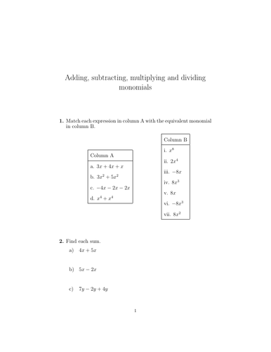 Multiplication Monomials Worksheet Resource Plans Adding Subtracting Sumnermuseumdc Org